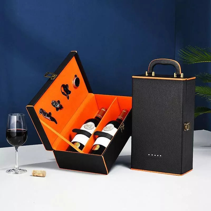 Luksusowa skrzynka na 2 butelki wina z akcesoriami wnętrze pomarańczowe