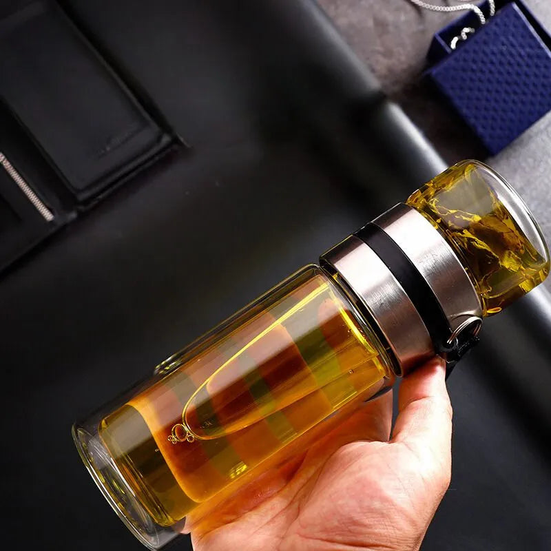 Ta przenosna i odporna na temperature butelka do herbaty to idealne rozwiazanie dla milosnikow herbaty, ktorzy sa w ciaglym ruchu lub pragna pelnego doswiadczenia zaparzania. Wykonana ze szkła borokrzemianowego z podwojnymi sciankami, utrzymuje temperature napoju przez dluzszy czas, bedac idealna dla ulubionych herbat. Wyposazona w filtr ze stali nierdzewnej pozwala cieszyc sie czystymi i aromatycznymi naparami bez pozostalosci. Co wiecej, szklana pokrywka moze posluzyc jako filiżanka, do ktorej mozna wlac bezposrednio herbate. Uszczelka silikonowa zapewnia szczelne zamkniecie, zapobiegajac niechcianym wyciekom. Latwa do przenoszenia, ta butelka jest niezbednym akcesorium dla kazdego milosnika herbaty, ktory ceni wygode i jakosc.