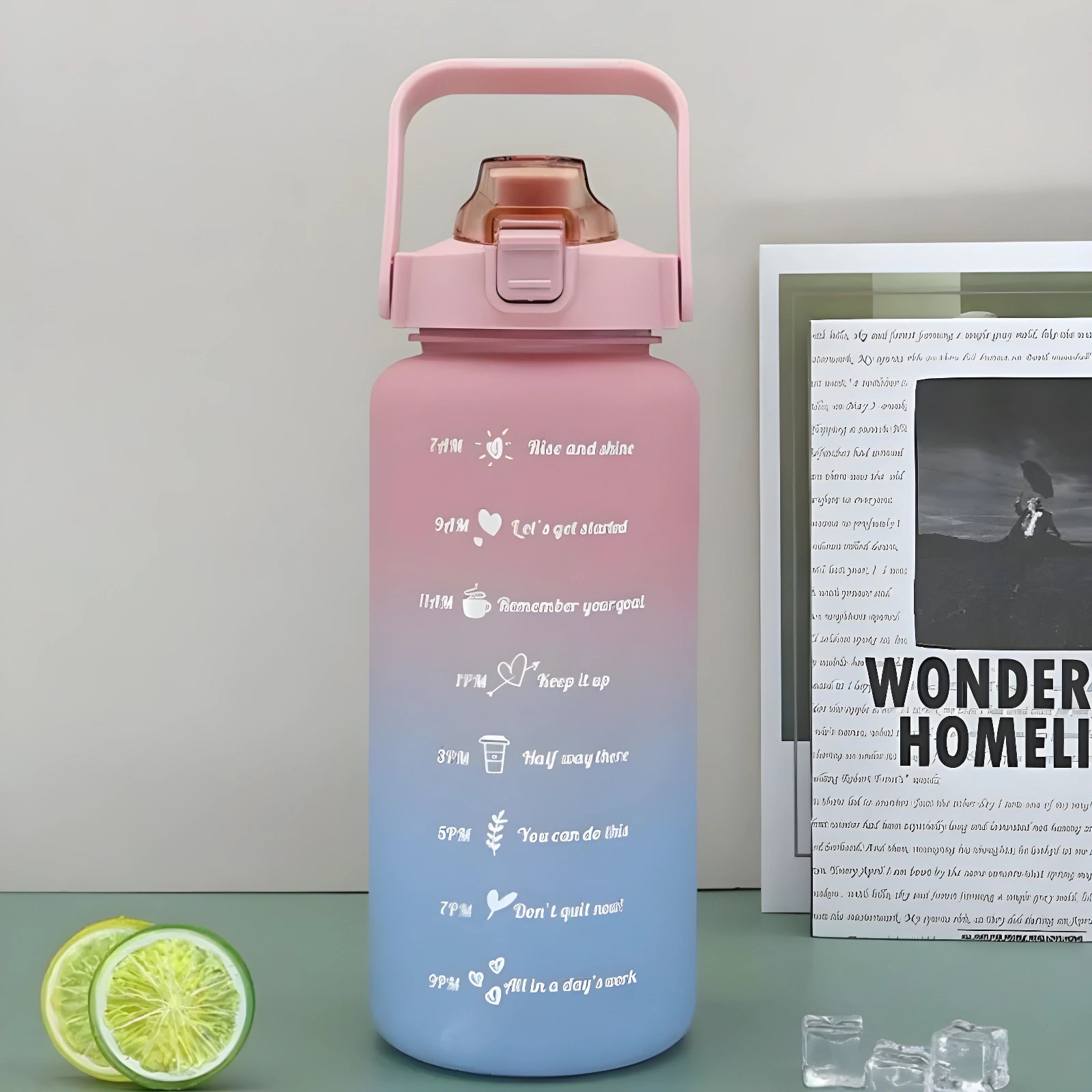 Zestaw 3 butelek na wode z motywacyjnymi napisami to idealny wybor dla osob, ktore chca prowadzic zdrowy, zorganizowany i pozytywny styl zycia. Kazda butelka ma nadrukowane komunikaty motywacyjne oznaczone godzinami, ktore przypominaja o regularnym nawodnieniu w ciagu calego dnia. Od „Rise and shine” po „You did it!” – kazdy napis dodaje energii i usmiechu.