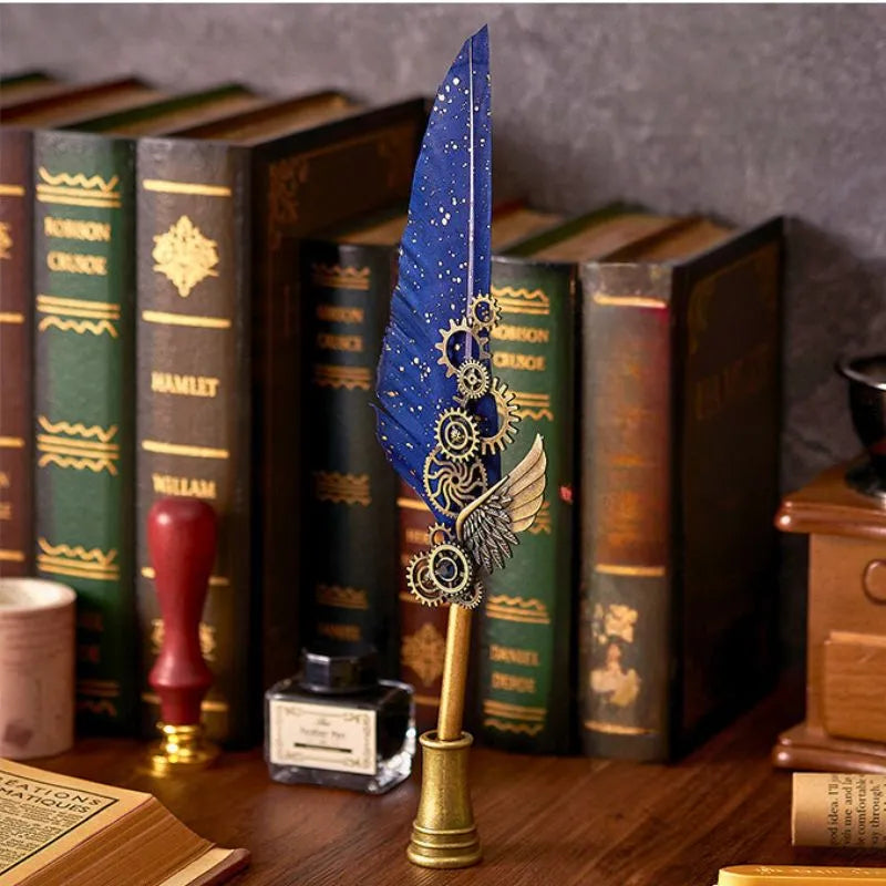 Zestaw kaligraficzny vintage z piorem niebieskim i akcesoriami to idealna propozycja dla milosnikow pisania recznego, sztuki oraz klasycznych dodatkow biurowych. To elegancki i funkcjonalny komplet, ktory zachwyci nie tylko wygladem, ale rowniez mozliwoscia tworzenia wyjatkowych tekstow i ozdobnych liter.