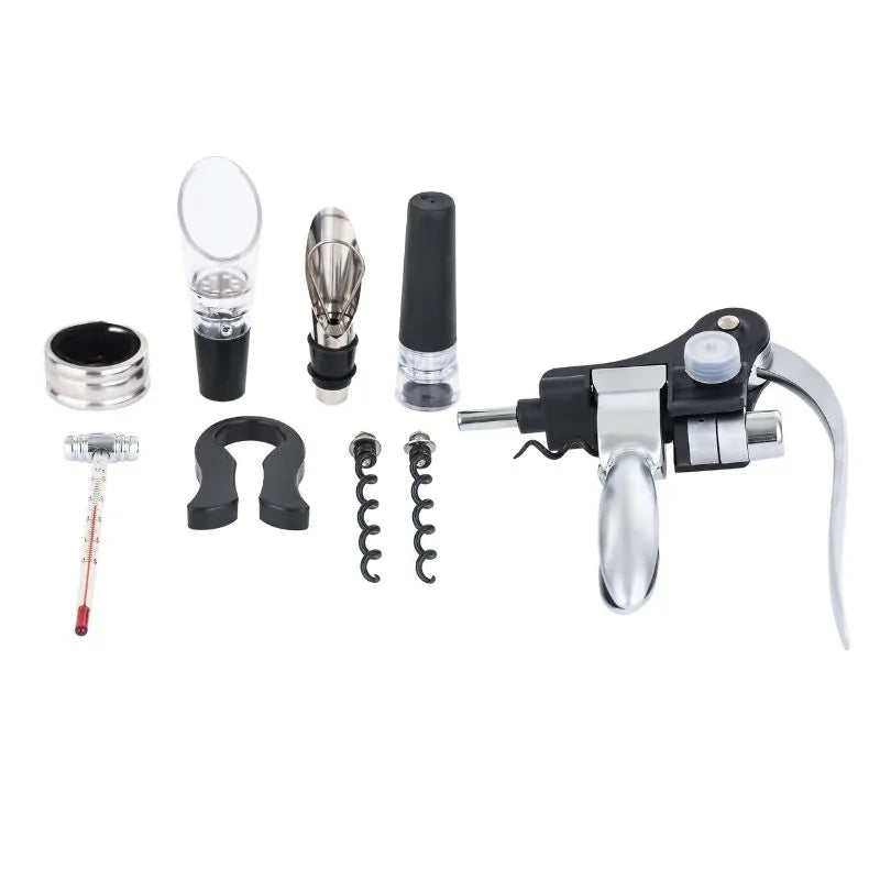 W skład zestawu wchodzą: korkociąg metalowy, korek do butelki, dwa nalewaki, nożyk do folii, termometr paskowy, pierścień antykapkowy, aerator oraz dwie zapasowe spirale. Każdy element ma swoje miejsce, co ułatwia przechowywanie i korzystanie z zestawu.